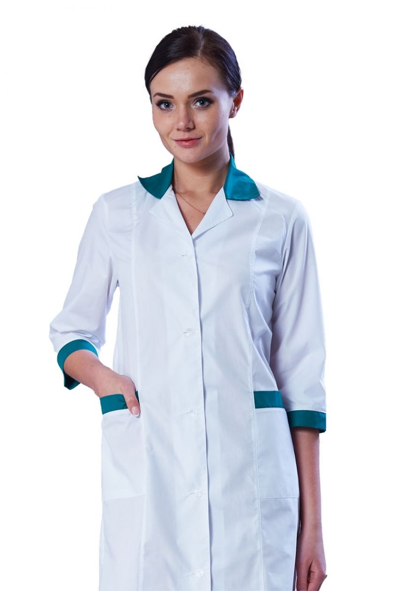 Халат полуприлегающего силуэта с центральной бортовой застежкой на пуговицы. Полочки с рельефами от линии плеча, с двумя нижними карманами с обтачками зеленого цвета. По линии талии спинки хлястик, с застежкой на пуговицы. Воротник отложной с лацканами. Верхний воротник контрастного цвета.