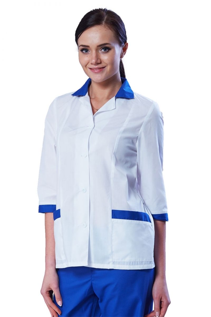 Блузка с центральной бортовой застежкой на пуговицы. Полочки с рельефами от линии плеча, с двумя нижними накладными карманами. Верхние срезы карманов обработаны контрастной отделкой. Спинка с хлястиком, втачанным в боковые швы. Воротник отложной, с лацканами. Верхний воротник контрастного цвета. Рукава втачные одношовные, с отделочными василькового цвета.