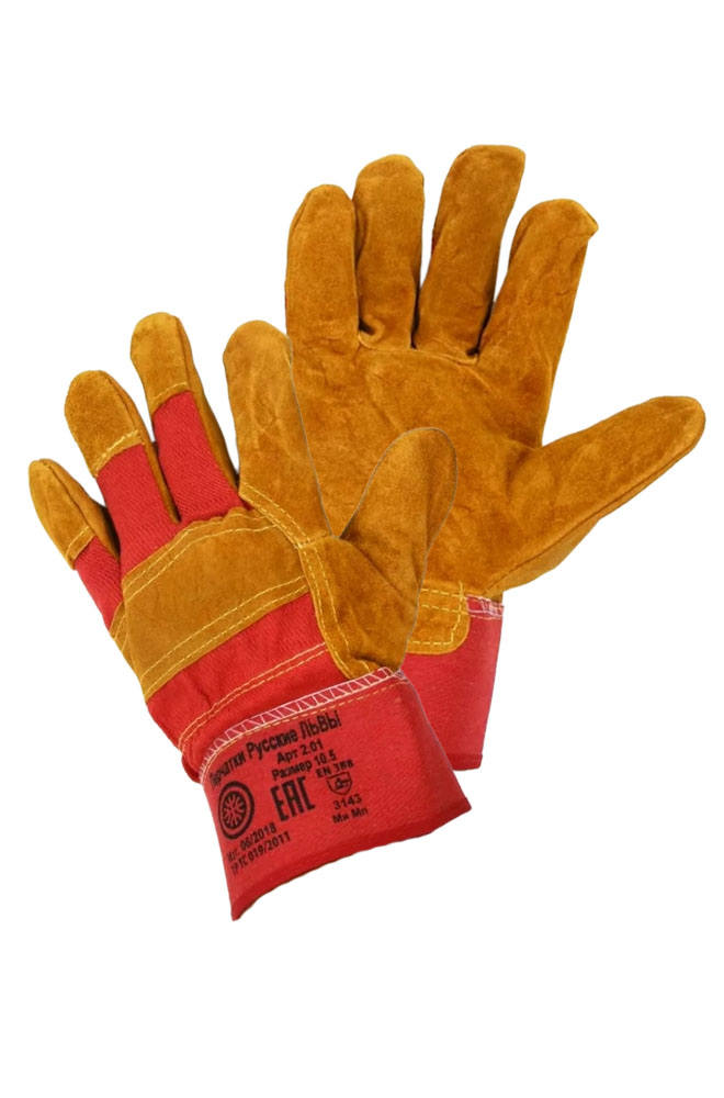 Перчатки из 100% кожевенного спилка сорта КРС с усилением на ладонной части и пальцах дополнительным слоем кожи. Манжеты крага, швы двойные.
