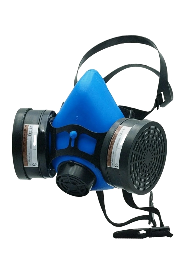 Модель: полумаска из мягкого гипоаллергенного эластомера с двумя сменными фильтрами А1В1Р1. Герметичная изоляция по всей линии обтюрации. Регулируемое оголовье.