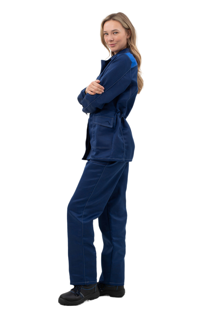 ➠ Куртка прямая, с центральной бортовой супатной застежкой на петли и пуговицы. Воротник отложной. Полочки с рельефами. Два нижних накладных кармана с фигурными клапанами. Левый нагрудный карман с отделением для ручки. Рукава с манжетами, застегивающимися на пуговицу. В области талии кулиса со шнуром и фиксатором.